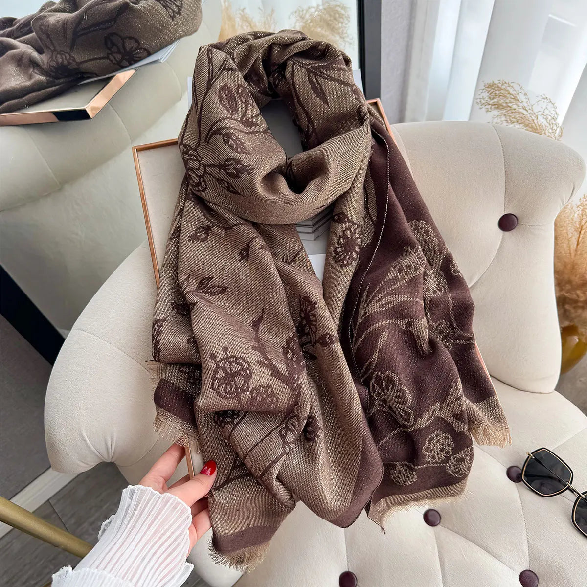 Designed with an elegant pattern and an irresistibly soft finish, this scarf feels indulgent yet beautifully lightweight against the skin.