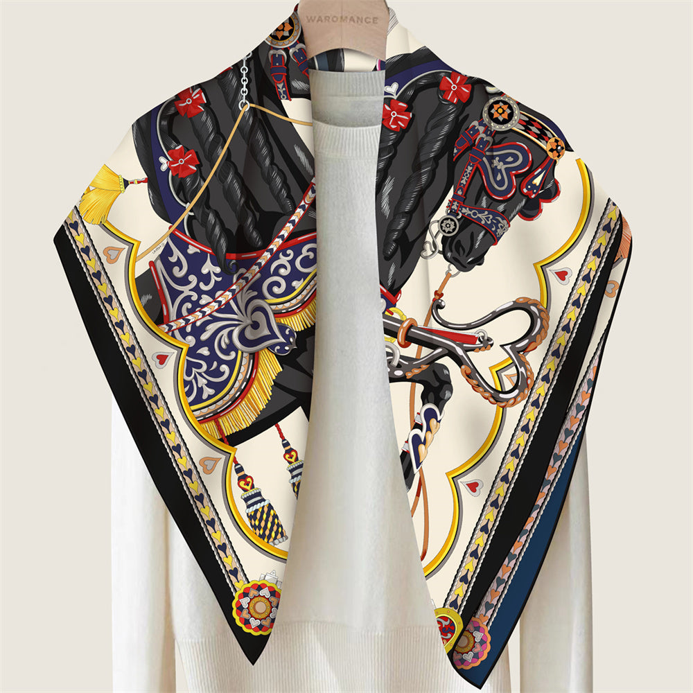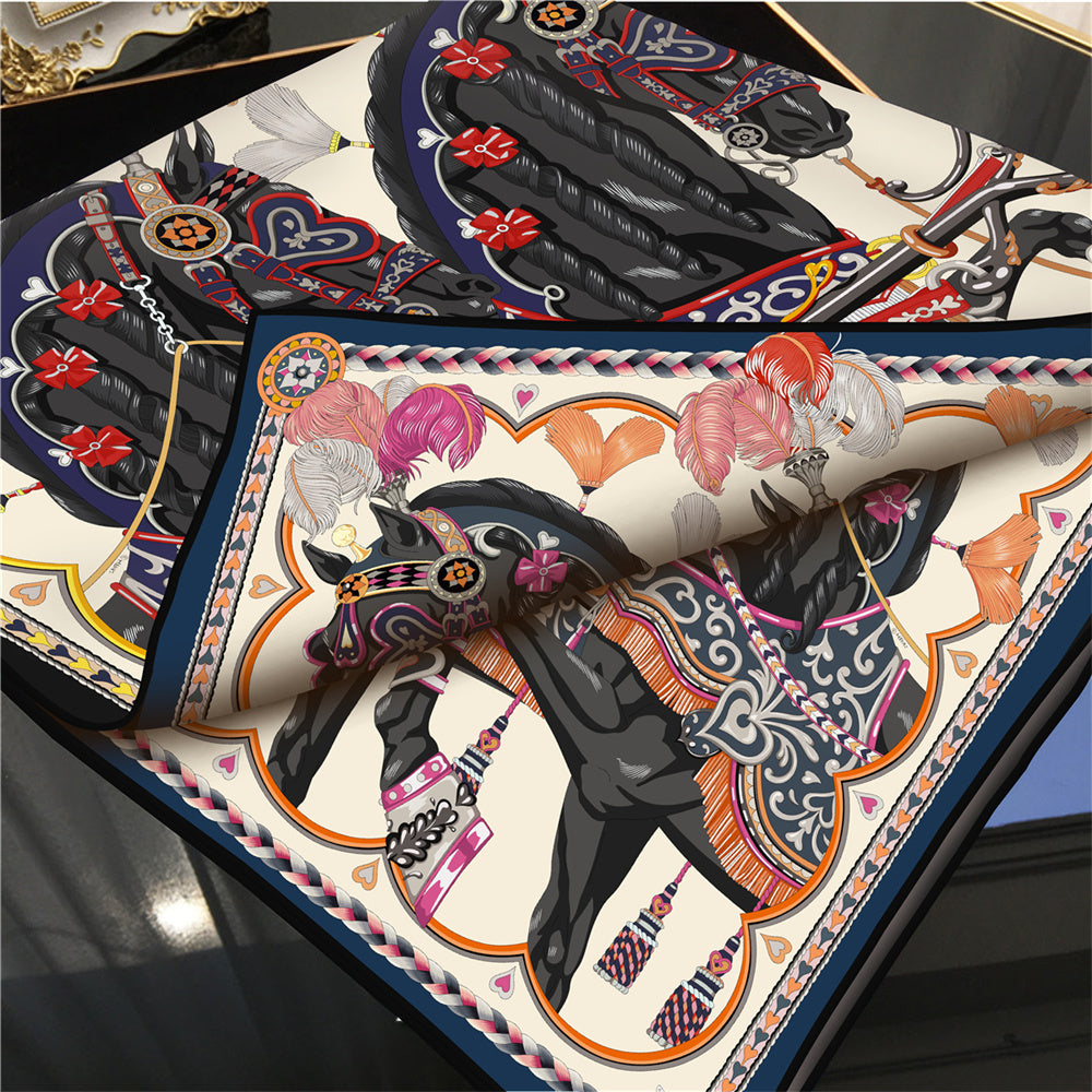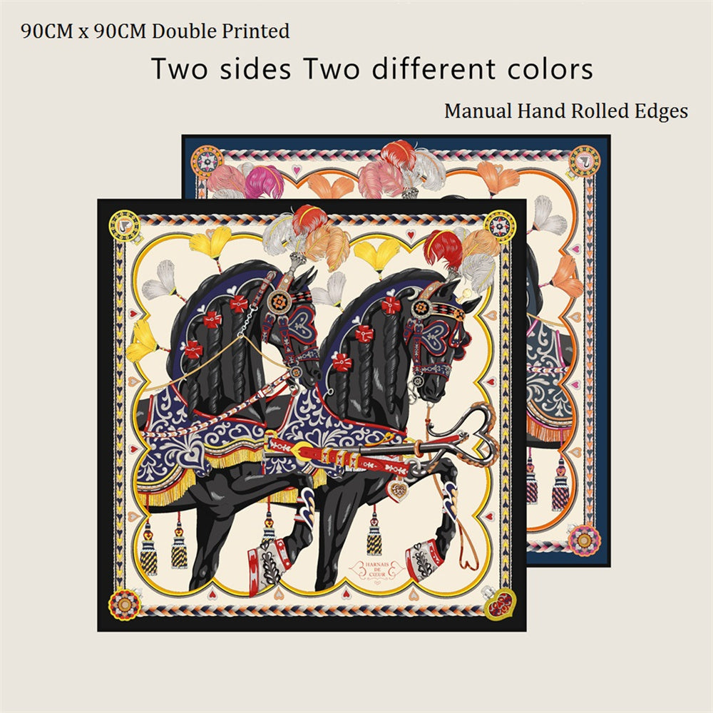 Double print scarf in silk twill with hand-rolled edges specially designed for horse lovers. This silk scarf is an infinite source of creativity and accessory that complements any outfit. It can be worn many ways - around your neck, as a top, at the waist or as a headscarf!